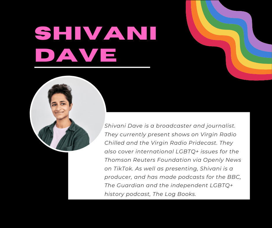 Shivani Dave: Shivani Dave is a broadcaster and journalist. They currently present shows on Virgin Radio Chilled and the Virgin Radio Pridecast. They also cover international LGBTQ+ issues for the Thomson Reuters Foundation via Openly News on TikTok. As well as presenting, Shivani is a producer, and has made podcasts for the BBC, The Guardian and the independent LGBTQ+ history podcast, The Log Books.